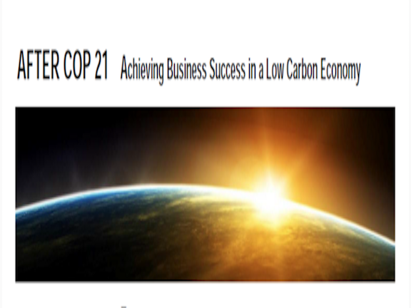 The impacts of the COP 21 climate agreements are sweeping through business, finance, and investment communities as well as advancing proactive governmental policies. Engagement of the private sector is critical to achieving the climate goals established in Paris and to preserving business competitiveness in a low carbon economy.