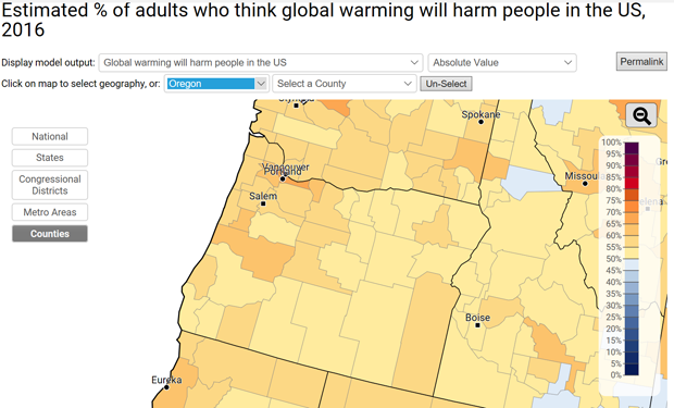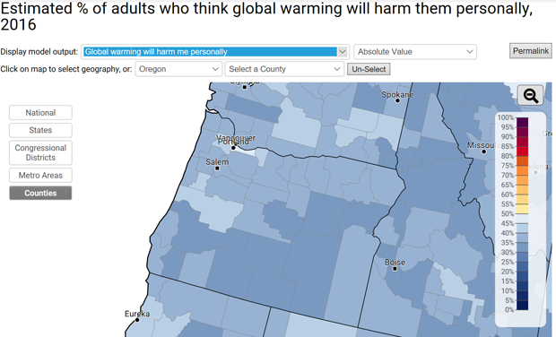 Yale’s research shows that on the “Six Americas” spectrum, people are far more motivated to solve a problem if they think they’ll be personally impacted by it. The below two maps help tell that story: take a look at Oregon—where a majority of folks think our country will be harmed (it’s even deeper belief that other countries will be), but very few want to believe they’ll be personally impacted: