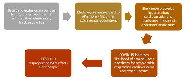 It's well understood by doctors and researchers that people with underlying conditions like hypertension and asthma are more vulnerable to complications from COVID-19. Recent reports have highlighted the tragic reality that COVID-19 disproportionately claims the lives of Black people, who disproportionately suffer from those underlying conditions, which are often caused and aggravated by air pollution. For decades, communities of color have experienced, been disproportionately affected by and have been fighting to reverse health burdens from air pollution and other environmental hazards, which is known as environmental racism. Like climate change, COVID-19 exposes and intensifies health disparities that exist in the United States for those most vulnerable. US policy is entrenched with systemic racism which has created wide-ranging disparities in health, wealth and more between people of color (particularly Black people) and white people.