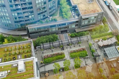 We were treated to the beautiful views from one of the upper floors of the Mirabella (photo at top of page), the nation’s first LEED-Platinum certified retirement community. Ecoroofs and rooftop gardens abound in this neighborhood.