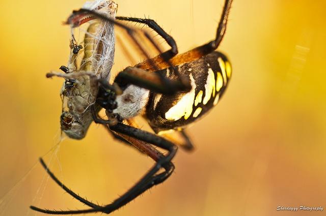 First, grasshoppers under stress from spider predation experience fear that leads to physiological changes that increase the ratio of carbon to nitrogen protein in their bodies. That spells less nitrogen protein in the system to feed microorganisms, so those microorganisms consume less carbon-rich organic matter. Therefore more carbon is retained in the soil. Plots with grasshoppers fearful of being eaten by spiders showed organic matter decomposition rates one-third those of plots without spiders.