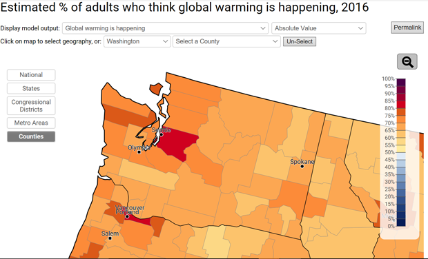 Yale’s research shows that on the “Six Americas” spectrum, people are far more motivated to solve a problem if they think they’ll be personally impacted by it. The below two maps help tell that story: take a look at Oregon—where a majority of folks think our country will be harmed (it’s even deeper belief that other countries will be), but very few want to believe they’ll be personally impacted:
