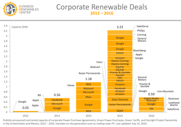The Rocky Mountain Institute (RMI)’s Business Renewables Center keeps the tally for new corporate renewable contracts as they become public and put together the following chart to demonstrate the past five year’s deals through July 2016: