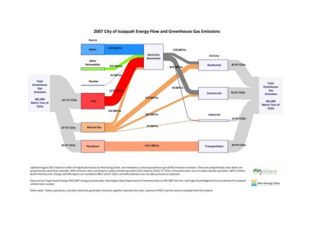 Below is the Energy Map that we created for the City of Issaquah. Total carbon emissions are depicted in the gray flow lines, by both source and end use. The blue flow line represents hydropower energy used for electricity generation; the green represents non-hydropower renewable energy used for electricity generation; the brown represents nuclear energy used for electricity generation; and the red represents coal energy used for electricity generation. The orange flow lines represent natural gas used for electricity generation and direct heating. The pink flow line represents petroleum used for transportation. The dark gray flow lines represent electricity consumption by residential, commercial, and industrial user categories. (See the PDF of this Energy Map here.)