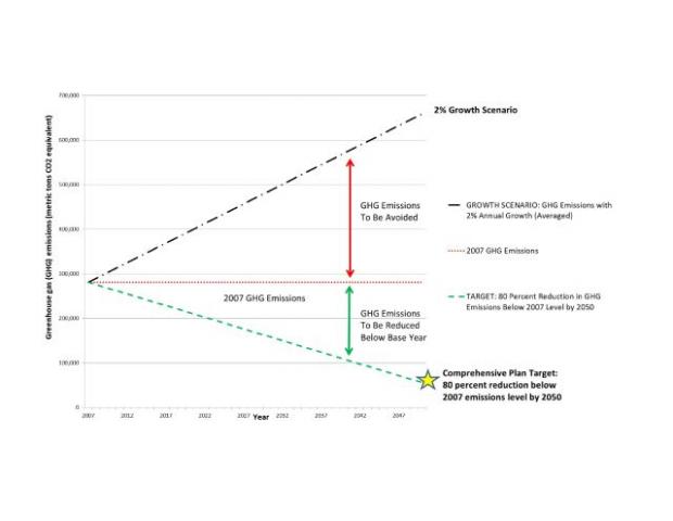- Analyze a community’s projected carbon emissions if no reduction measures are taken, in relation to baseline emissions and target reductions.