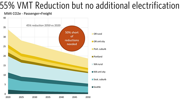But even with a transformative reduction in VMT, this shift does not get us to our pollution reduction goals in the region—in fact, it’s not even close. We see a 45% reduction in climate pollution by 2050, but we need to see at least a 95% reduction for Oregon and Washington.