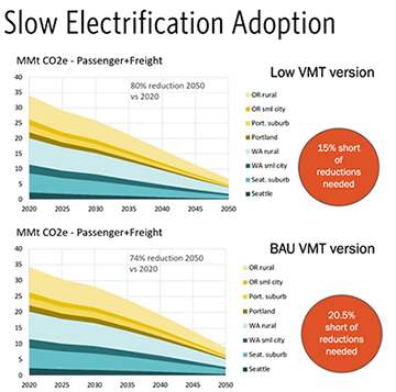 Automakers, consumers and others are already transitioning to electric vehicles. Some have argued that the private market is already adjusting and thus we do not need additional policies to accelerate the adoption of cleaner vehicles. So can we meet our climate goals for the Pacific Northwest and hold electrification at a slower rate compared to electrifying basically all vehicles by 2050? What if 80% of passenger vehicles, 90% of transit buses, 75% of medium-duty freight, and 72% of heavy-duty freight are electric by 2050, as opposed to nearly 100%? That’s still a big shift and unfortunately, it doesn’t get us to our goals for cutting pollution in the region.