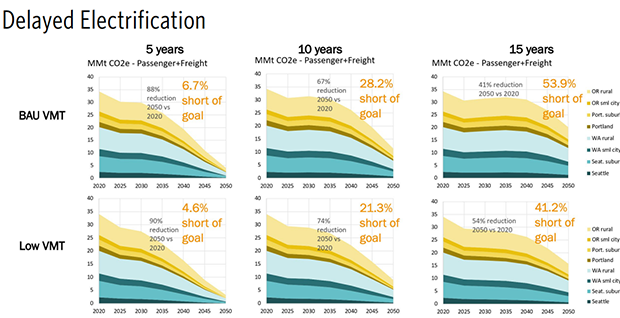 We often hear that “now is not the time” to push for climate action, including vehicle electrification. So what if we wait, and push out rapid vehicle electrification out by 5, 10, or 15 years? For example, what if we hit 100% electric passenger vehicles in 2055, rather than 2050? Unfortunately, even a five-year delay put us off track in ensuring greater climate stability. And longer delays would mean our region falls even further from our goal, even when paired with significantly reduced VMT.