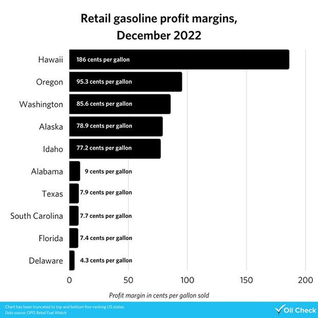 Washington State is one of the most profitable places in the country to sell fuel. For every gallon of gas you buy at the pump, retailers pocket about $0.85—compared to Alabama, Texas, or South Carolina where their profit is less than $0.10.