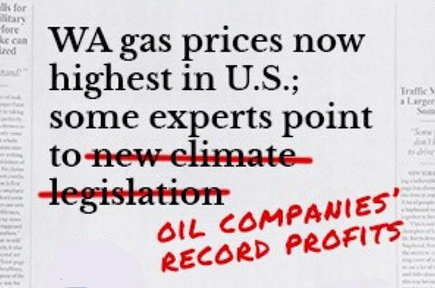 While Washingtonians are feeling the burden of high gas prices, big oil is playing a blame game—trying to make you believe that high prices are caused by our state's groundbreaking climate protections (as in the deceptive headline pictured above), when in reality they’ve been gratuitously increasing their profit margins.