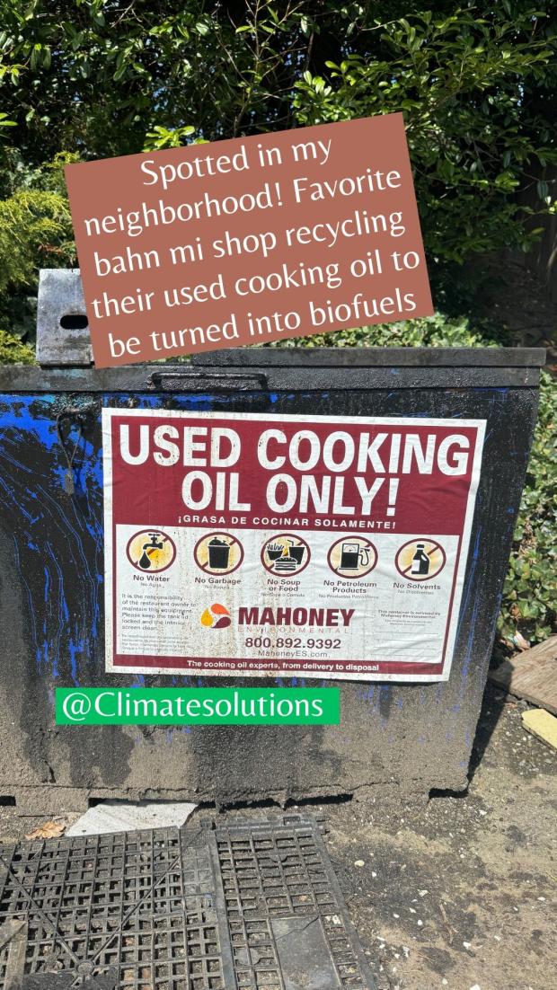 X/Twitter- Spotted in Edmonds! An awesome bahn mi shop recycling their used cooking oil to turn into biofuels. Love to see it #JoyspotCleanEnergy for #EarthDay [image below]
