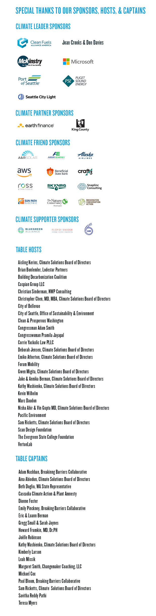 I have deep gratitude for our speakers, sponsors, captains, hosts, board and staff, technical crew, the band that led us into the ballroom to kick things off, volunteers, and supporters for making this event possible. Climate Solutions’ supporters are an integral part of our organization, and we are deeply grateful to those who have already donated towards our $350,000 goal. If you haven’t had the chance to make your donation yet, it’s not too late. Here are some ways to give.