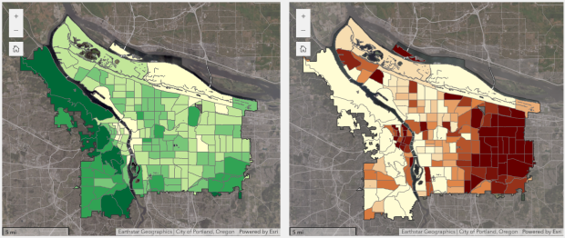 Major thoroughfares running through Portland’s Lents (top) and Laurelhurst (bottom) neighborhoods. Note the distinct differences in tree canopy.