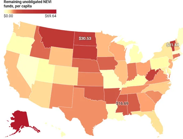 Rural and midwestern states may have more funds to lose, per person, if NEVI funds are rescinded. See interactive map.