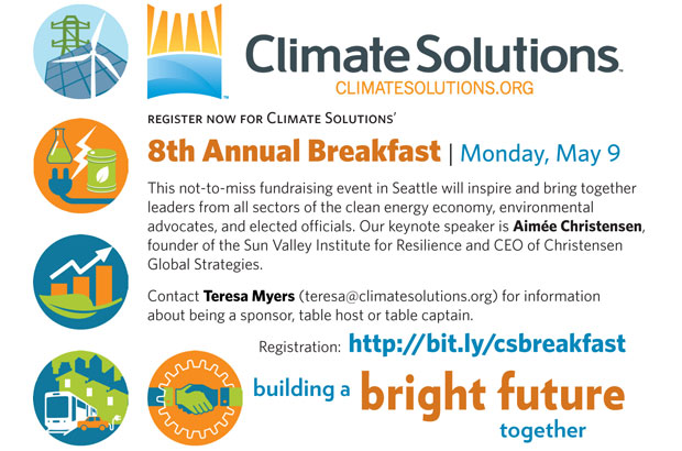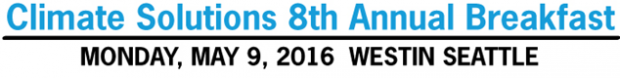 We hope you can join us for our Climate Solutions 8th Annual Breakfast on Monday, May 9, 7:00am-9:00am - a not-to-miss fundraiser event that will inspire and bring together leaders from all sectors of the clean energy economy, environmental advocates, and elected officials.
